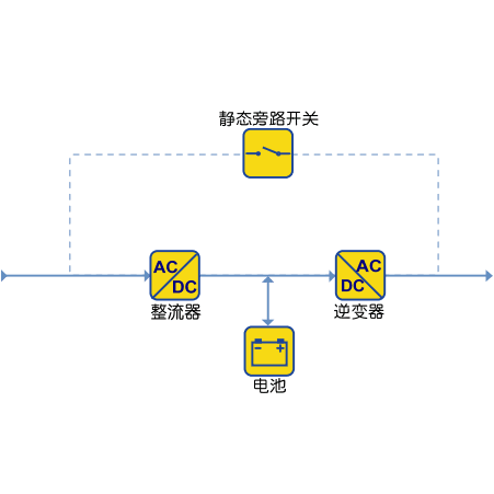 ? ??這是10KVA以上功率范圍的電源最常用的UPS類型。在雙轉換在線式UPS的結構圖中,除了主電源路徑是逆變器(而非交流主電源)外,其余與后備式設計相同。